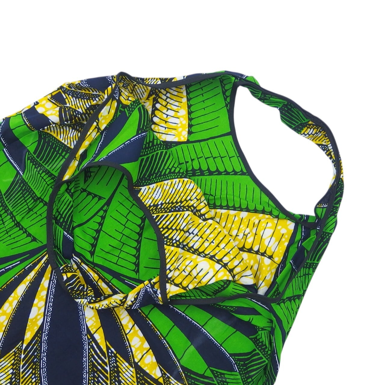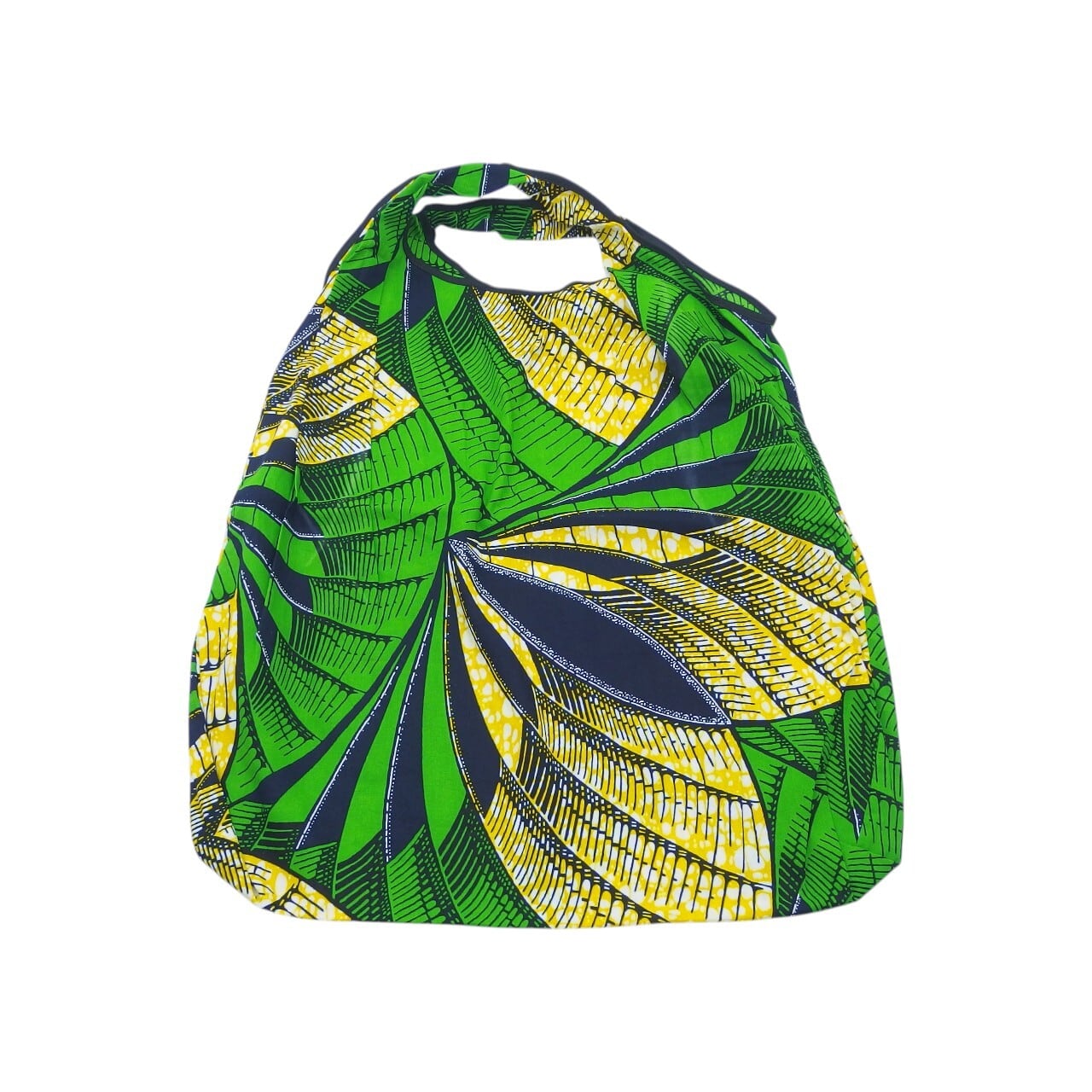 鮮やかなグリーンとイエローのコントラストが目を引く、アフリカンワックスプリントのエコバッグです。