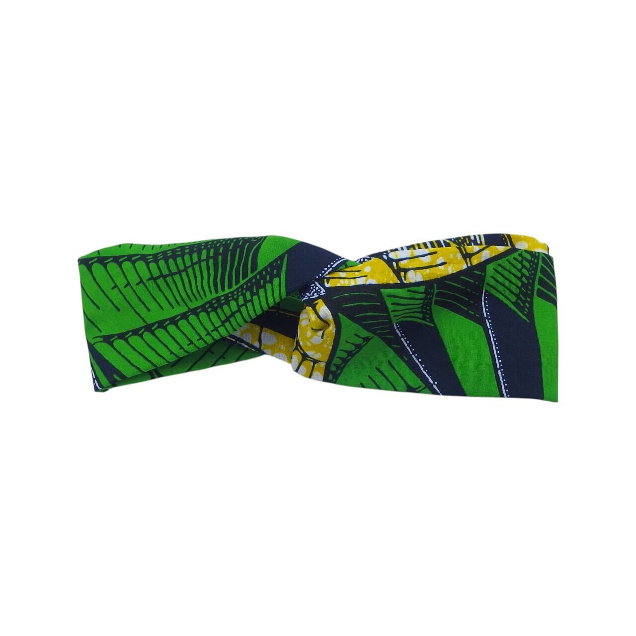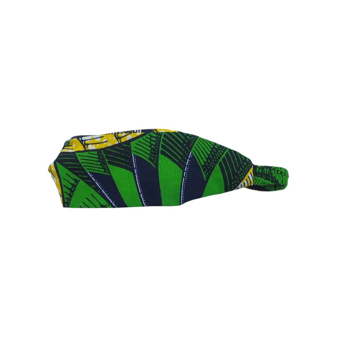 鮮やかなグリーンを基調に、深みのあるネイビーとイエローを組み合わせたアフリカンワックスプリントが魅力のヘアバンドです。