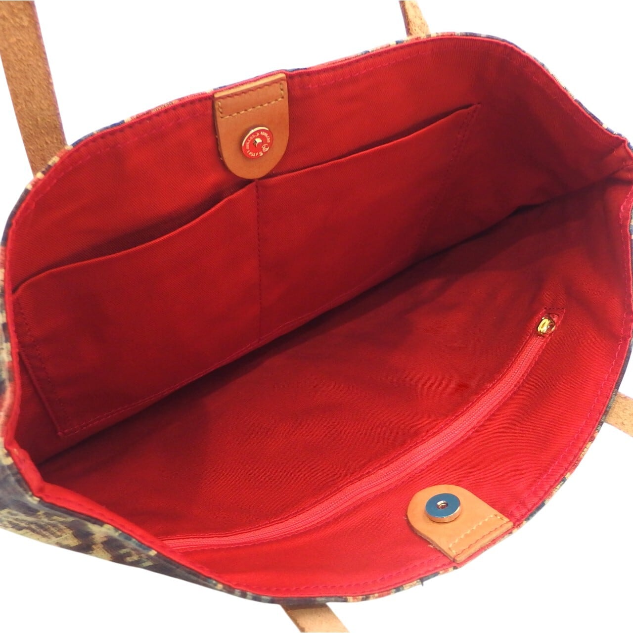 内側は鮮やかなレッドカラーの裏地で、開いたときのコントラストも魅力的。