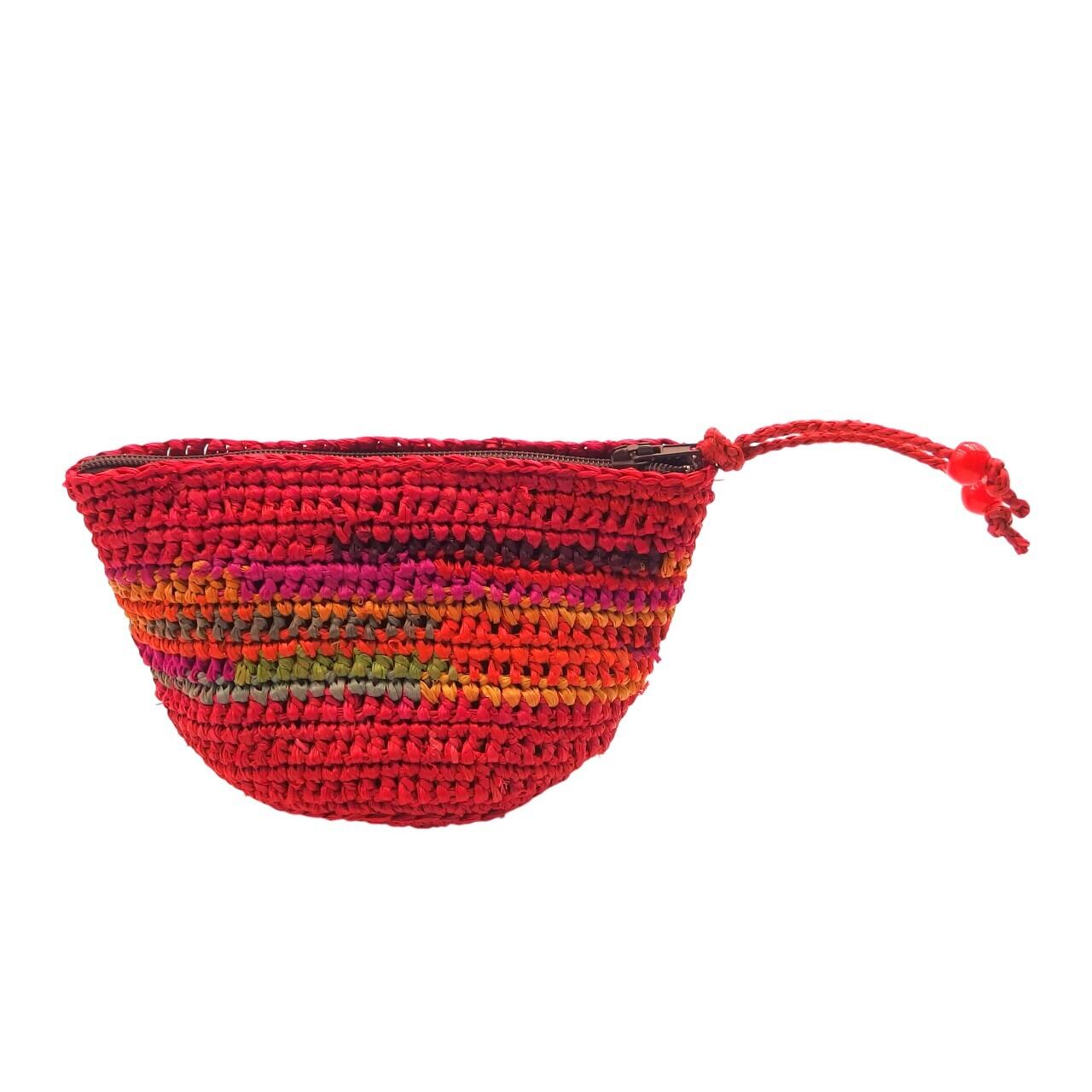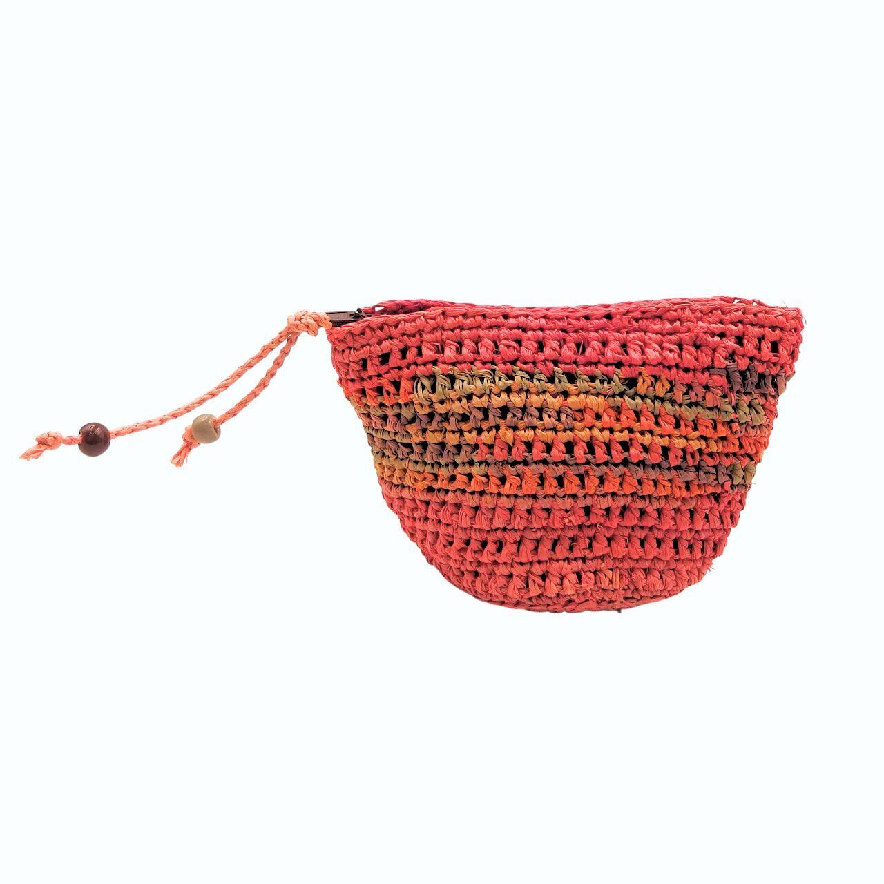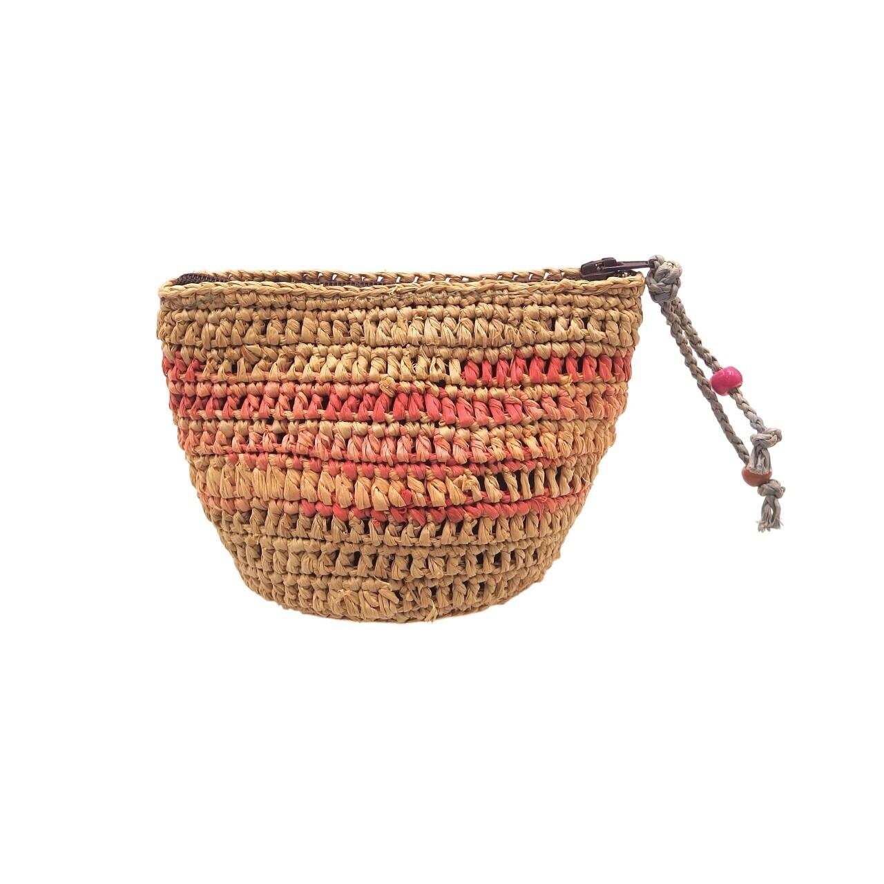 ラフィア (ヤシの葉を乾燥させて作られる天然繊維) を使用したミニポーチです。