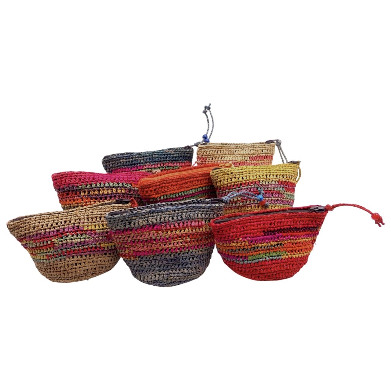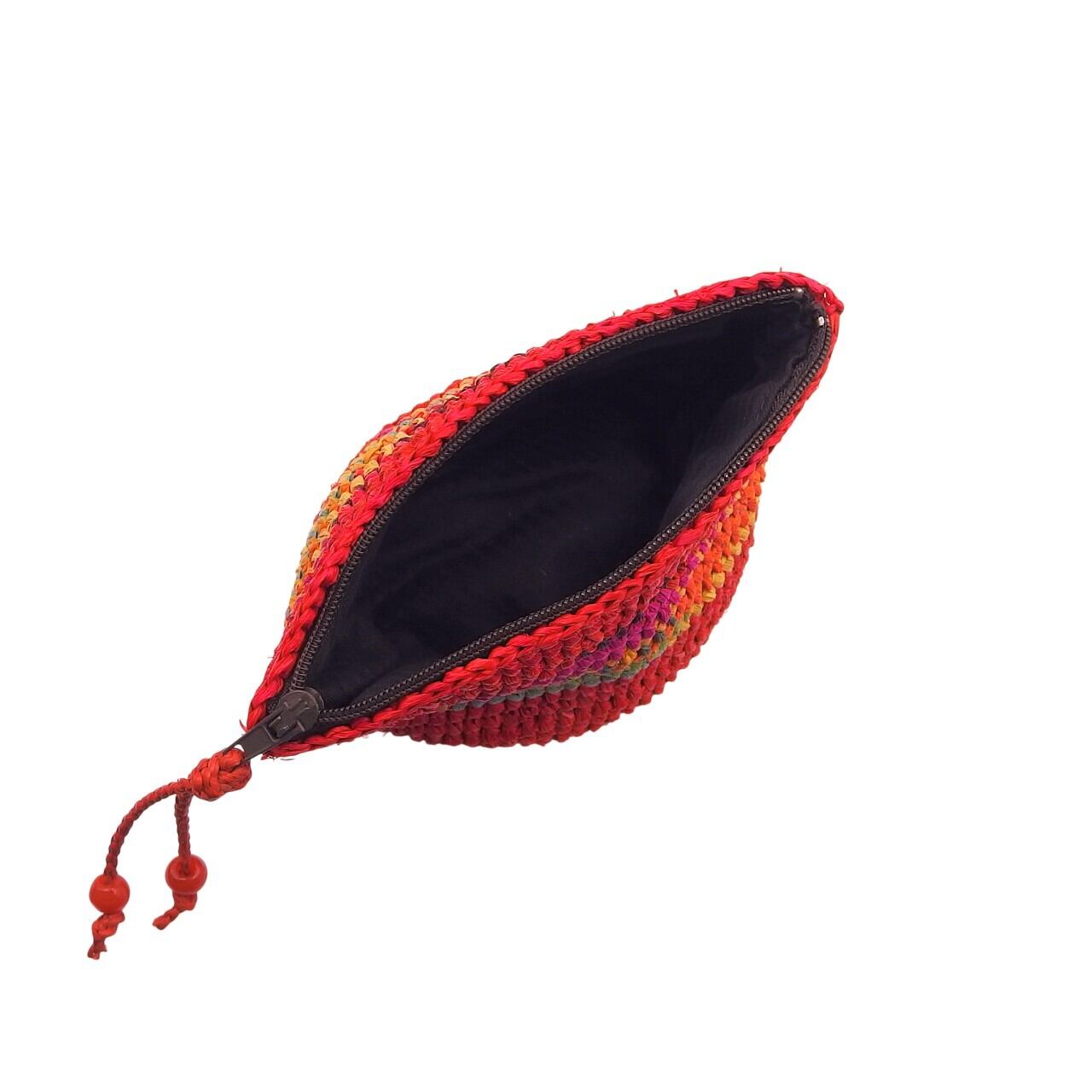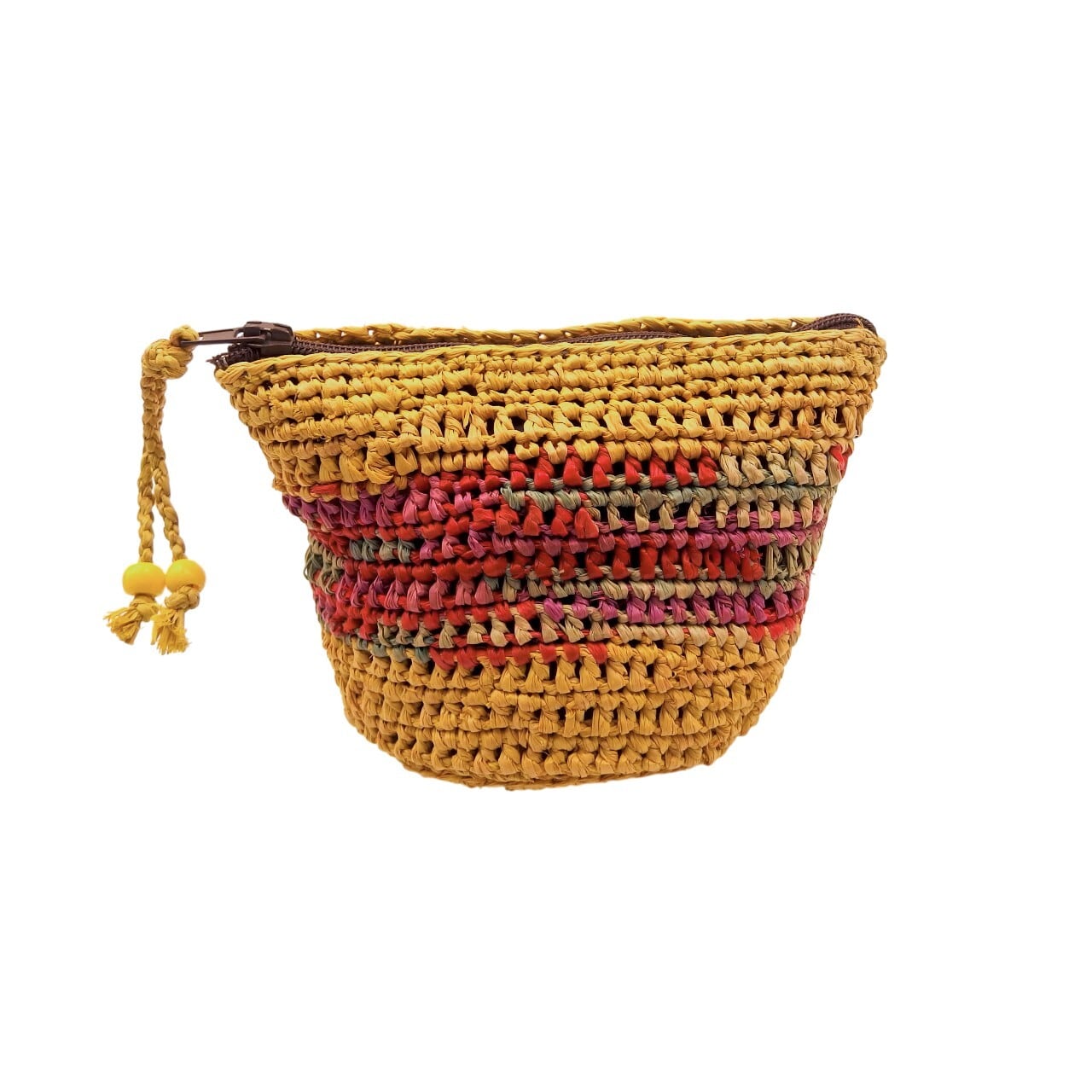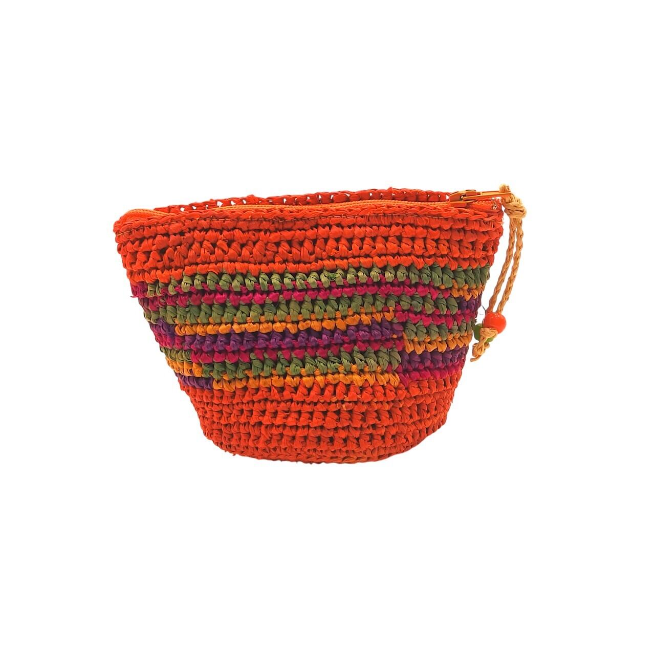 ラフィア (ヤシの葉を乾燥させて作られる天然繊維) を使用したミニポーチです。